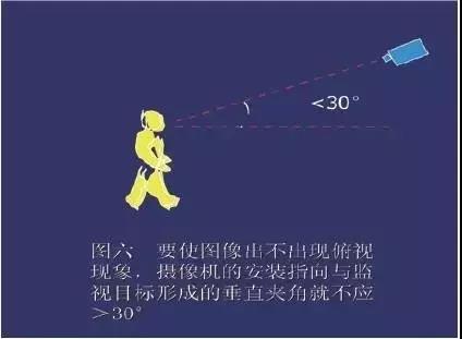 圖象出不會俯仰、側視問題,關鍵是看相機的指向和監視目标夾角的大(dà)小(xiǎo)(即視角大(dà)小(xiǎo)),該夾角分(fēn)垂直夾角和水平夾角(垂直夾角是相機的指向與被監視目标形成的高、低角度;水平夾角度是相機的指向,與監視目标正面形成的水平角度)。實踐證明,攝像機對焦所形成的垂直夾角小(xiǎo)于30°,在圖像上基本沒有俯視現象。攝像機的指向與監視目标正面方向形成的水平夾角≤45°,圖像基本無側視現象,攝像機安裝角度符合上述要求,基本能反映出所監視目标的正面特征。當然,這些夾角越小(xiǎo),對提高側視效果越好,側視效果就越好。見圖六、七。